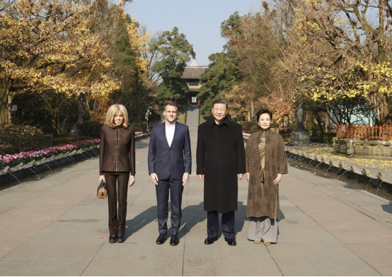 12月5日,国家主席习近平在四川省成都市都江堰同法国总统马克龙进行友好交流。这是习近平和夫人彭丽媛同马克龙夫妇合影。新华社记者丁海涛摄