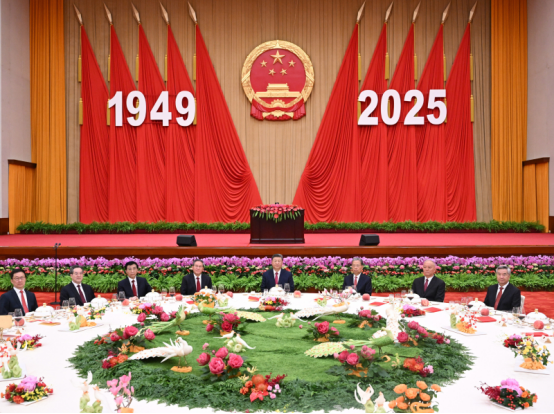 人民大会堂宴会厅华灯璀璨,洋溢着喜庆热烈的节日氛围。主席台上方高悬着庄严的国徽,“1949-2025”大字年号在鲜艳红旗映衬下格外醒目。