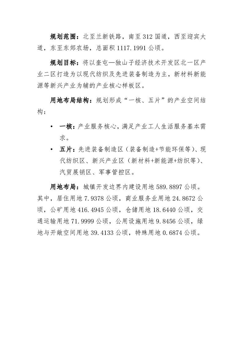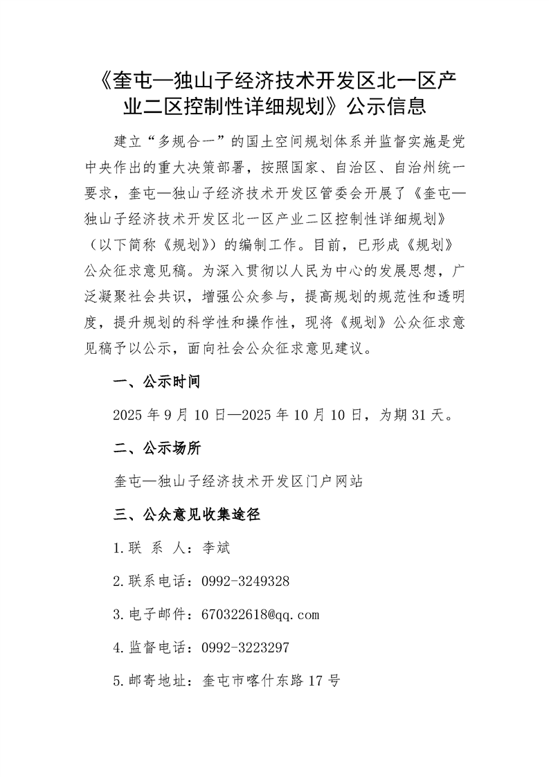 《奎屯—独山子经济技术开发区北一区产业二区控制性详细规划》公示信息
