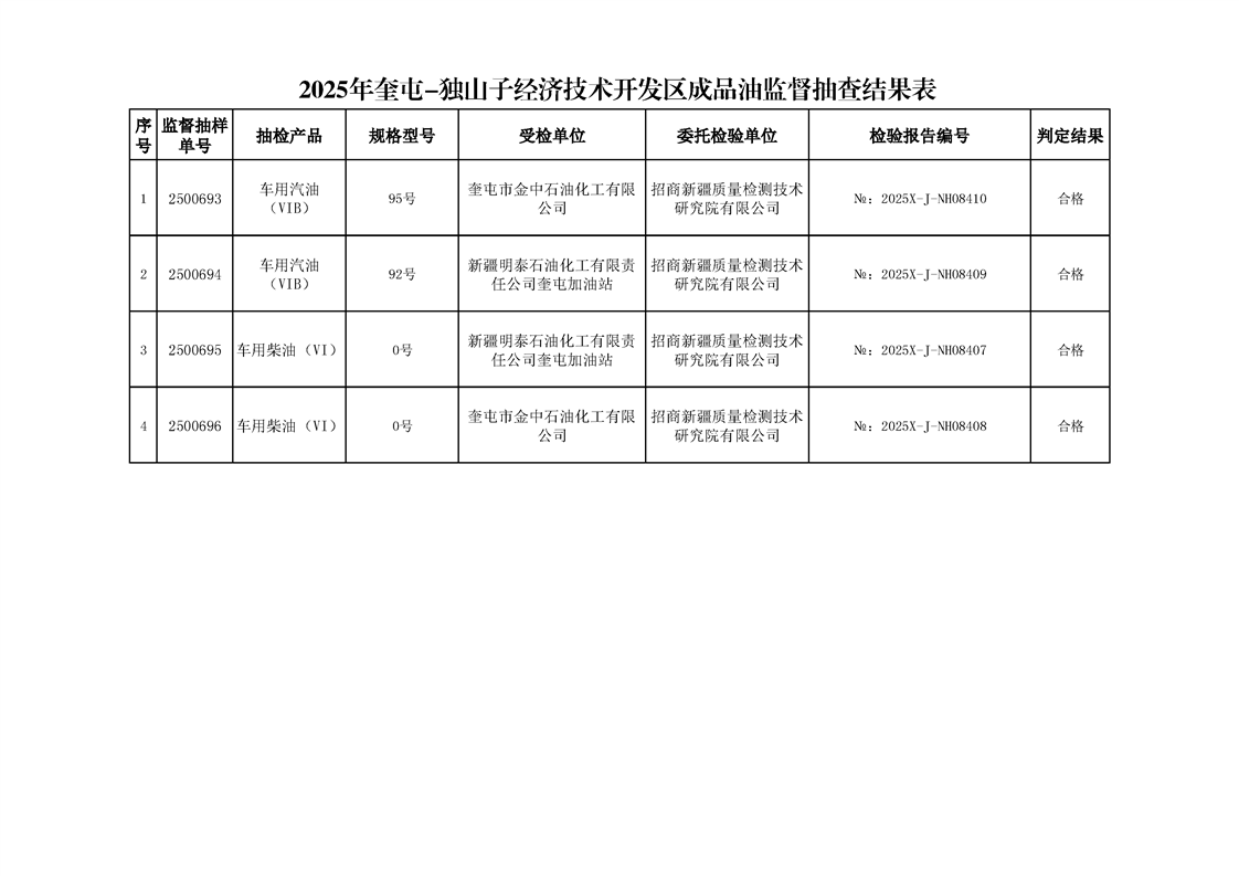 2025年度,奎屯—独山子经济技术开发区市场监督管理局对辖区成品油销售单位组织了产品质量监督抽查。现将监督抽查情况通报如下: