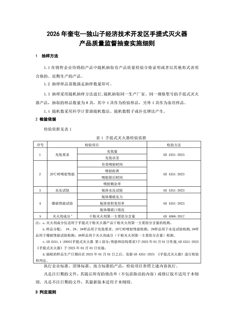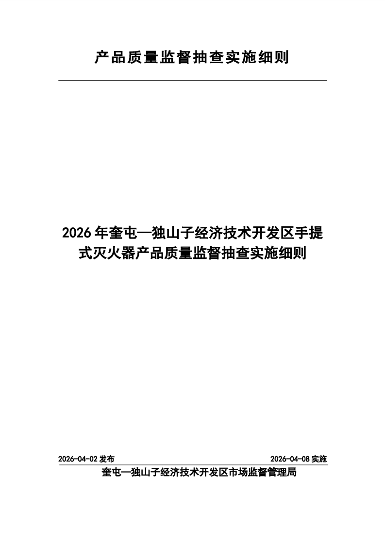 2026年奎屯—独山子经济技术开发区手提式灭火器产品质量监督抽查实施细则