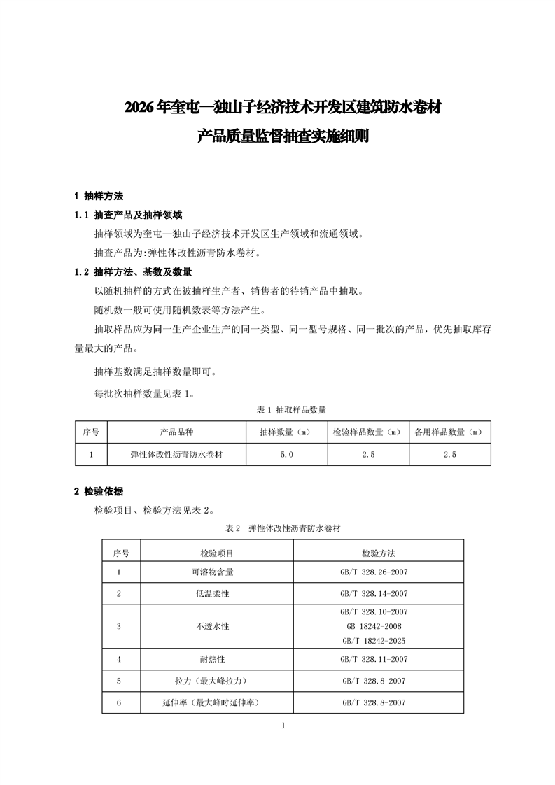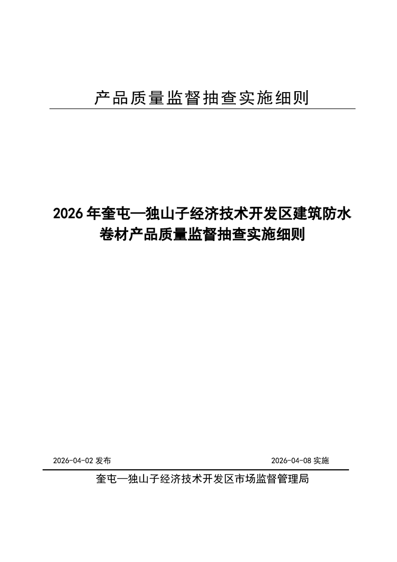 2026年奎屯—独山子经济技术开发区建筑防水卷材产品质量监督抽查实施细则