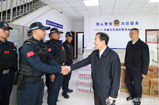 10月5日,自治区党委书记、兵团党委第一书记、第一政委陈小江在乌鲁木齐市公安局二道桥街道派出所,看望慰问基层政法干警,向节日期间坚守岗位的一线干部职工致以亲切问候。石榴云/新疆日报记者 崔志坚摄
