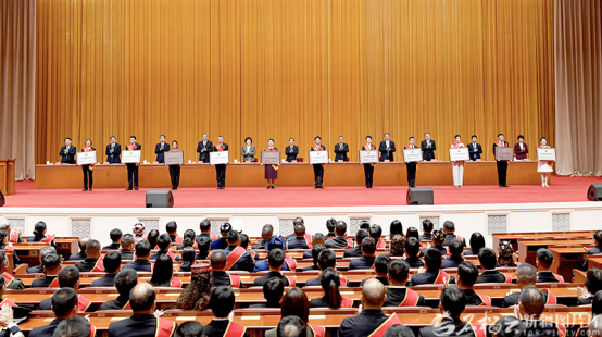 在欢快的乐曲声中,陈小江等领导同志为模范集体和模范个人代表颁发奖牌、荣誉证书和奖章。