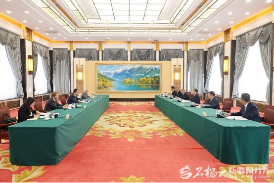 11月6日,自治区党委书记陈小江、自治区主席艾尔肯·吐尼亚孜在乌鲁木齐会见土耳其驻华大使于纳尔。石榴云/新疆日报记者崔志坚摄