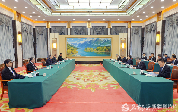 12月2日,新疆维吾尔自治区党委书记陈小江、新疆维吾尔自治区主席艾尔肯·吐尼亚孜在乌鲁木齐会见巴基斯坦规划、发展与特别倡议部部长阿赫桑·伊克巴尔。石榴云/新疆日报记者崔志坚摄