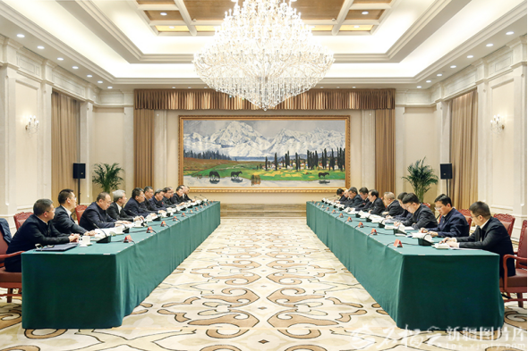 12月4日,新疆维吾尔自治区党委书记陈小江、自治区主席艾尔肯·吐尼亚孜在乌鲁木齐会见中国中铁股份有限公司董事长陈文健一行。石榴云/新疆日报记者谢龙摄